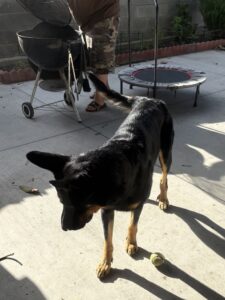 ボールで遊ぶ犬。奥ではホストファザーがBBQの準備中
